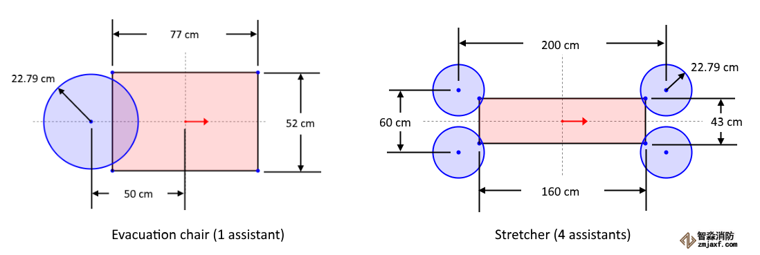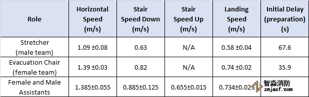 在醫院里,日班由七名助手組成。使用疏散椅進行疏散準備需要兩名助手,但在疏散椅子的過程中只需要一名助手。為了表示一名助手正忙著準備病人,疏散椅的模擬假設只有六名助手參與了疏散運動。對于夜班,只有四名助手,在疏散期間,每個擔架需要四名助手。