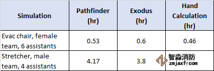 不出所料,Pathfnder的疏散時間比人工計算的要長,因為人工計算不包括由于通過門或在樓梯上轉彎而導致的任何減速。對于疏散椅的情況,Pathfnder的結果比建筑物疏散計算短12%。這可能是因為Pathfnder不包括延遲,例如開門的時間,這些都包括在建筑物出埃及記的計算中。對于拉伸器的情況,Pathfnder的結果比建筑物出埃及計算慢10%。這可能是由于在著陸時擔架被打開時,Pathfnder中的運動模式顯著降低了速度。考慮到在Pathfnder和建筑物疏散中運動建模的基本差異,計算的疏散時間可以認為是相同的。