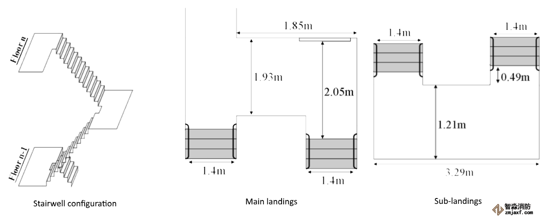圖2顯示了要疏散的醫院樓層的基本幾何圖形。在此圖中,某些尺寸(如走廊門寬度)是通過縮放圖形來估計的。圖3顯示樓梯的幾何圖形。樓梯的關鍵尺寸是每一步都有一個臺階17.5厘米和一連串的29厘米,每段樓梯有12個樓梯,樓梯的寬度為1.4米扶手之間。