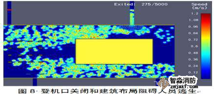 根據模擬結果能夠看出,室內建筑布局結構往往會對人員疏散的速度產生很大影響。當室內建筑物布置過多或過于集中,通道設置不合理,會嚴重影響人員緊急疏散的效率。如圖 8,該候機區域的椅子分布面積過大、擺放間距過寬,對部分人員的撤離造成了一定的阻礙。 因此在日常維護和管理中,注重功能建筑設置的科學性。對重點防火單位,如書店和服飾店, 應盡量保證不能將其挨在一起設置,避免起火時火勢容易迅速蔓延的情況發生。