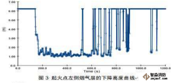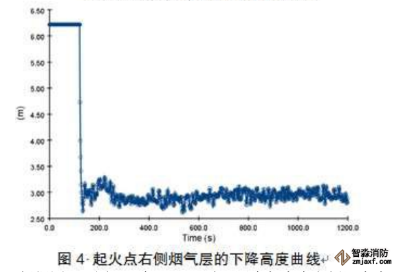 H s 為煙氣層高度; H p 為人眼特征高度; H b 為建筑物頂棚高度; H c 為對人構成危險的臨界高度。設人眼高度為 1. 7 m, 則通過上公式可知該防火分區發生火災時, 煙氣層對人構成危險的臨界高度為 2. 4 m。 當煙氣層的高度下降到 2. 4 m 時, 對人員構成危險。 如圖 3、 圖4 為起火點兩側在整個模擬過程中煙氣層的下降高度圖。