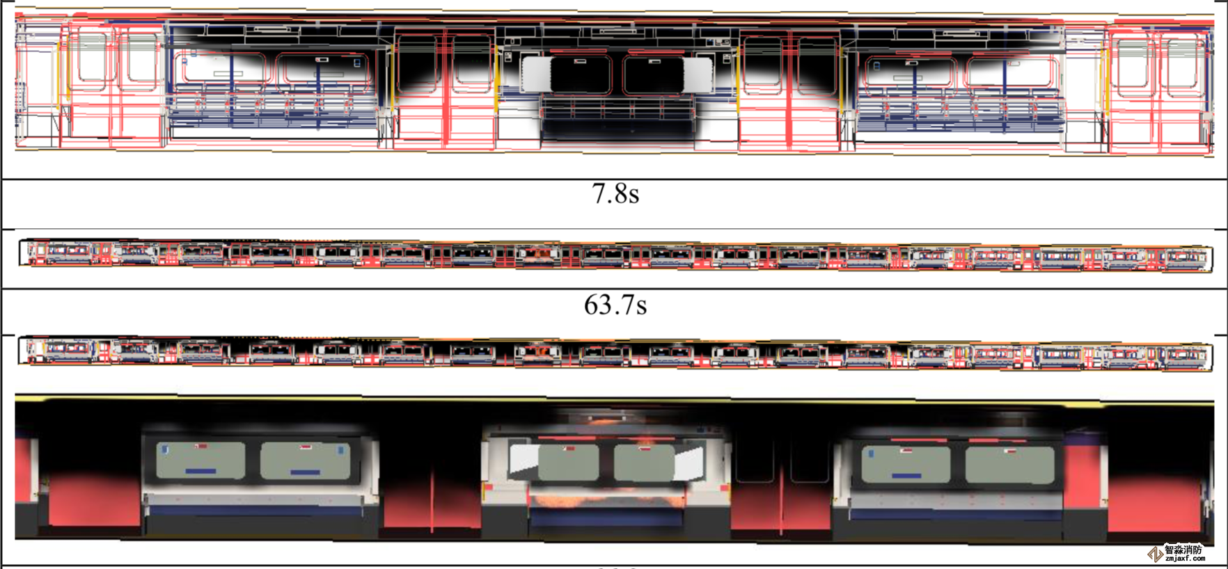 地鐵列車車廂內部火災模擬,車廂內部火災情況下人員應急逃生模擬。
