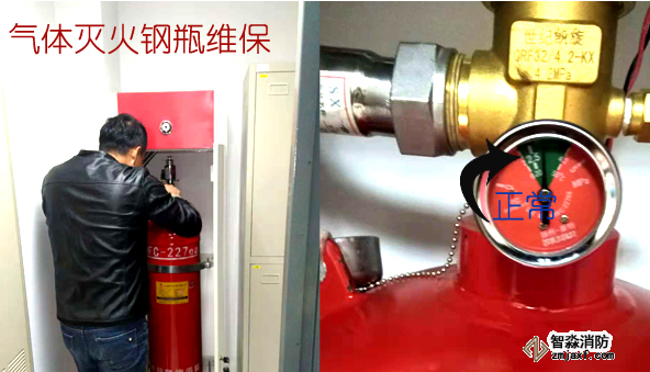 1)檢查每個滅火劑瓶組和驅動氣體瓶組的壓力,壓力表的壓力指示值應在綠色區域內。