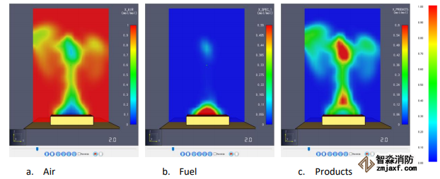 在任何位置,空氣、燃料和產物的體積分數總和為 1。這些量的典型等值線如圖 8 所示??諝馐谴蟛糠帜P偷拇蟛糠煮w積分數。 燃料是從火面釋放出來的產物是由燃料和空氣混合產生的。 每單位體積的熱釋放率 (HRRPUV) 繪圖顯示了燃燒的位置。